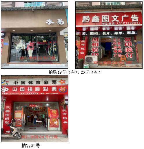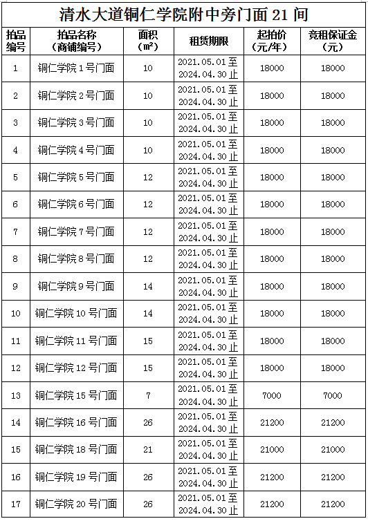 1.拍品1至21號(hào)標(biāo)的位于銅仁市清水大道銅仁學(xué)院附中旁,面積7——28㎡,租賃期3年(2021.05.01至2024.04.30止),交通便利,人流量大。