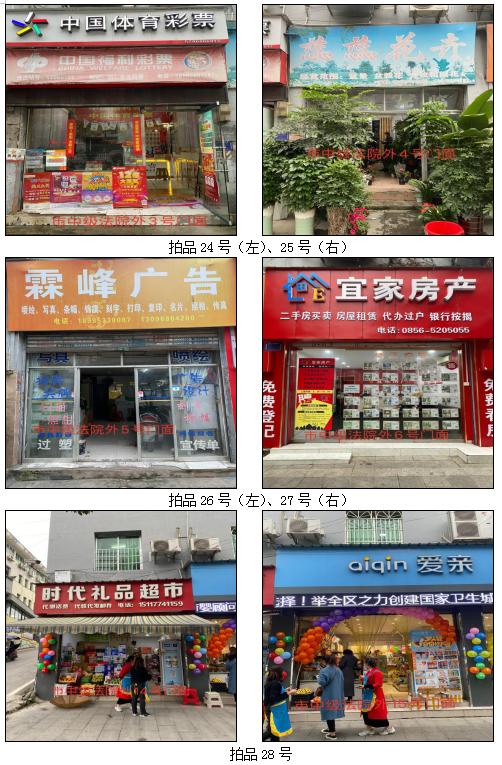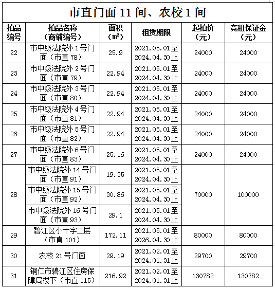 1.拍品22至28號(hào)標(biāo)的位于銅仁市中級(jí)人民法院外,面積:19.35——30.86㎡,租賃期3年(2021.05.01至2024.04.30止),交通便利,其中28號(hào)標(biāo)的包含3個(gè)門面(市直91號(hào)、92號(hào)和93號(hào))為整體拍租。