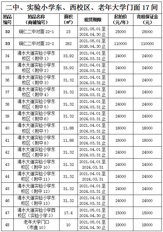 1.拍品32號(hào)標(biāo)的位于銅仁二中對(duì)面,面積23㎡,租賃期3年(2021.05.01至2024.04.30);