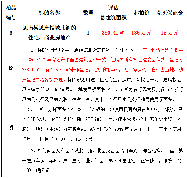 2、思南縣思唐鎮(zhèn)城北街的住宅、商業(yè)房地產(chǎn),建筑面積共:380.41㎡;起拍價:136萬元;競買保證金15萬元。