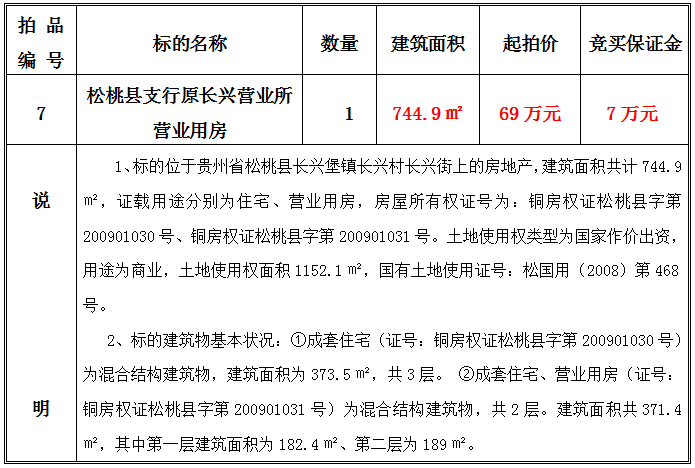 3、松桃縣支行原長興營業(yè)所營業(yè)用房,建筑面積共:744.9㎡;起拍價:69萬元;競買保證金:7萬元。