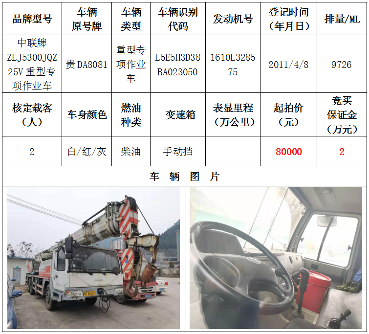 1、中聯(lián)牌重型專項作業(yè)車一輛,起拍價:80000元,競買保證金:2萬元;