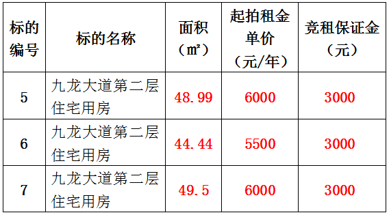 5、九龍大道第二層住宅用房1號、2號、3號,面積分別為:48.99㎡、44.44㎡、49.5㎡,租賃期均為:3年,起拍租金單價分別為:6000元/年、5500元/年、6000元/年,競租保證金分別為:3000元;