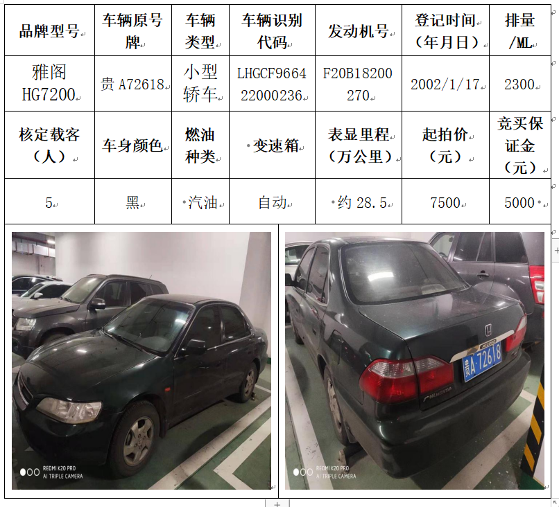 拍品編號2:雅閣HG7200小型轎車一輛