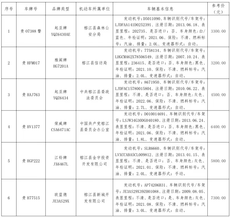 受委托,本公司于2021年10月27日(星期三)下午14∶30時(shí),在榕江縣財(cái)政局會(huì)議室,對(duì)以下標(biāo)的物按現(xiàn)狀現(xiàn)樣進(jìn)行公開拍賣。