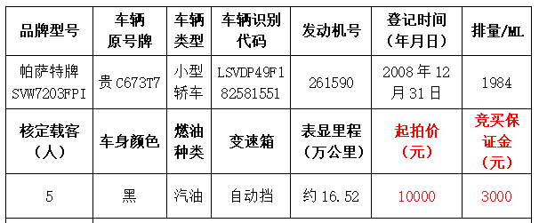 本次拍賣會的拍品編號6:帕薩特牌SVW7203FPI小型轎車原機動車登記證書遺失,拍賣成功后委托方將協(xié)助買受人補辦遺失證件完成過戶手續(xù)。