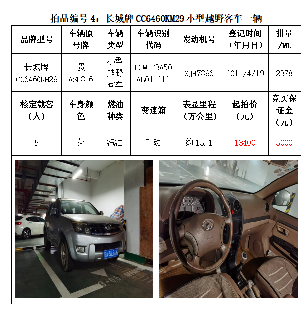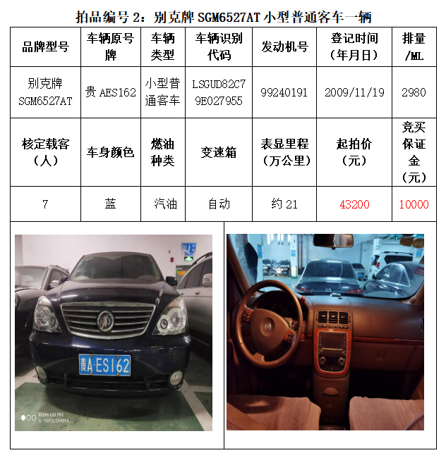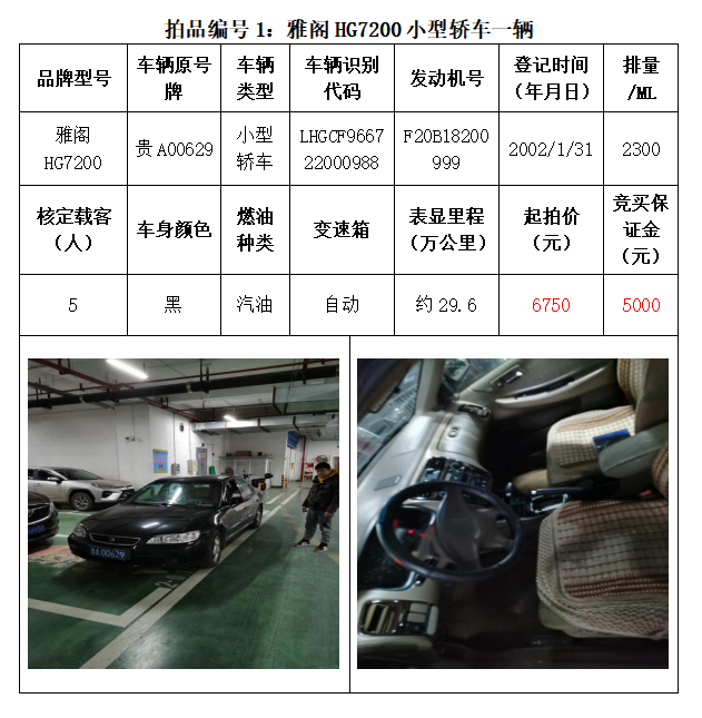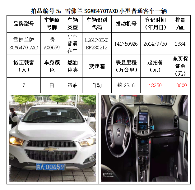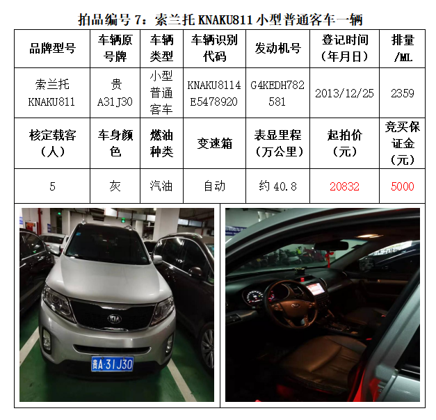 一、拍賣標(biāo)的:雅閣HG7200小型轎車1輛、別克牌SGM6527AT小型普通客車1輛、途勝KMHJN81D95U小型越野客車1輛、長城牌CC6460KM29小型越野客車1輛、雪佛蘭SGM6470TAXD小型普通客車1輛、尼桑牌ZN6453WAG3小型普通客車1輛,索蘭托KNAKU811小型普通客車1輛,共計(jì)7輛車。