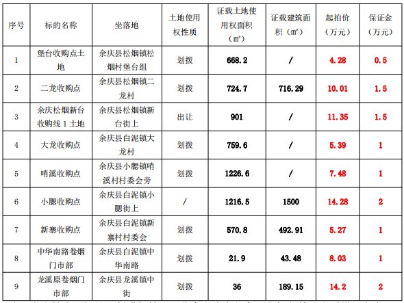 該標(biāo)的位于余慶縣松煙鎮(zhèn)松煙村堡臺,證載土地面積:668.2㎡,土地使用權(quán)類型:劃撥,證載用途:煙葉收購,土地證號:余國用(2007)第869號。