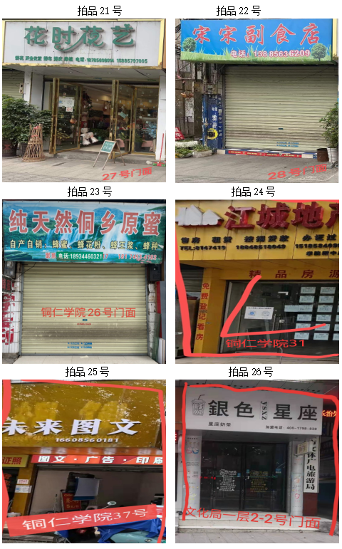 拍品14至22號標(biāo)的:位于清水大道銅仁農(nóng)校旁,地理位置優(yōu)越,屬于黃金大道。附近有大專、中學(xué)、小學(xué)、幼兒園等,教學(xué)配套齊全;擁有眾多小區(qū),人口流動能力強(qiáng),固定人口較多;周圍有超市、商場,人口流動性強(qiáng)。地理位置優(yōu)越,屬于臨街門店,升值空間較大;地區(qū)基礎(chǔ)設(shè)施完善,公共交通、公共停車設(shè)施的增加,使該地升值空間進(jìn)一步增大;建筑結(jié)構(gòu):磚混,面積:27.6㎡至42.4㎡不等(具體面積見上表),租賃期3年(具體日期見上表),保養(yǎng)情況:較好。