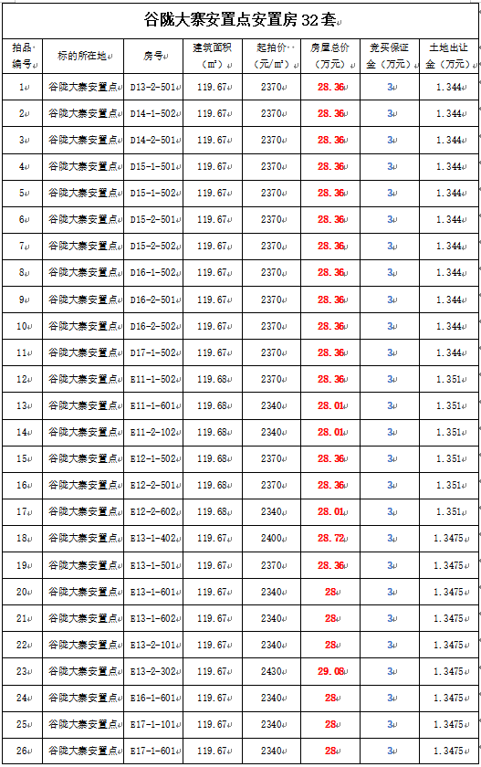 1、黃平縣谷隴大寨安置房32套,建筑面積:79.06—119.68㎡,起拍單價:2340—2430元/㎡,起拍總價:18.5—29.08萬元;
