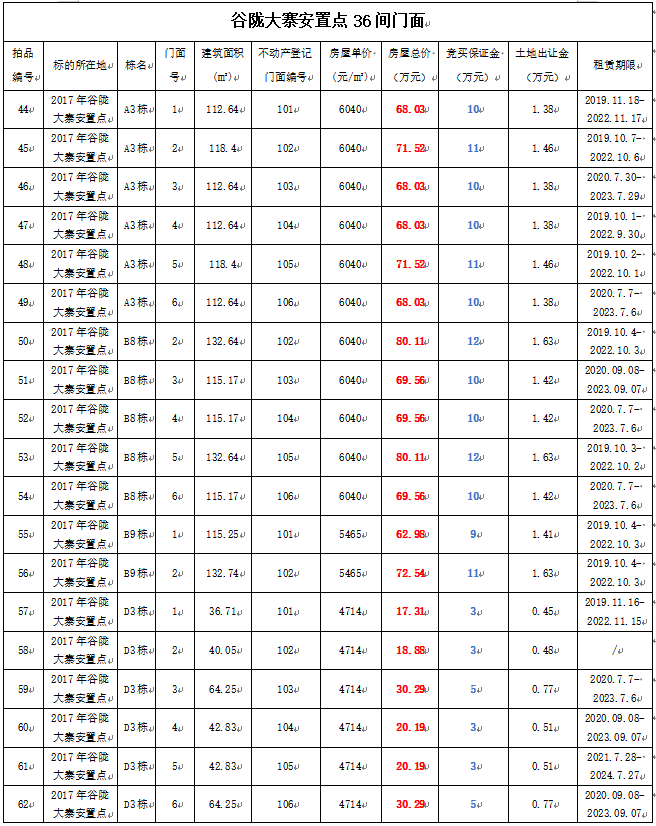 4、黃平縣谷隴大寨安置點門面36間,建筑面積:34.09—132.74㎡,起拍單價:4073—6040元/㎡,起拍總價:13.88—80.11萬元;