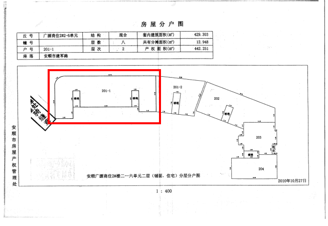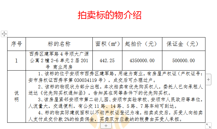 1、安順市西秀區(qū)建軍路4號順大廣源公寓2幢2-6單元2層201-1號商業(yè)用房,位于地面1層(對面為安順市第二幼兒園),建筑面積約442.25㎡。