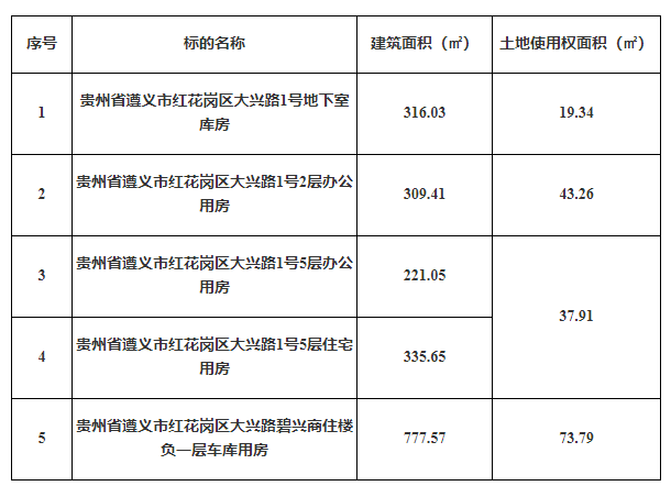 2、貴州省遵義市紅花崗區(qū)大興路1號地下室?guī)旆浚偨ㄖ娣e:316.03㎡);貴州省遵義市紅花崗區(qū)大興路1號2層辦公用房(總建筑面積:309.41㎡);貴州省遵義市紅花崗區(qū)大興路1號5層辦公用房(總建筑面積:221.05㎡);貴州省遵義市紅花崗區(qū)大興路1號5層住宅用房(總建筑面積:335.65㎡);貴州省遵義市紅花崗區(qū)大興路碧興商住樓負(fù)一層車庫用房(總建筑面積:777.57㎡)。